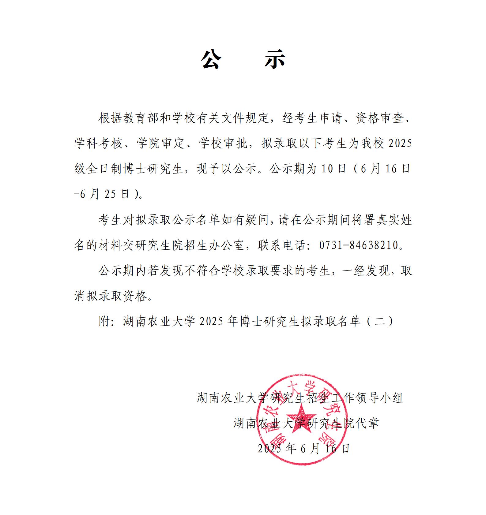 湖南农业大学2025年博士研究生放弃拟录取名单公示(二)