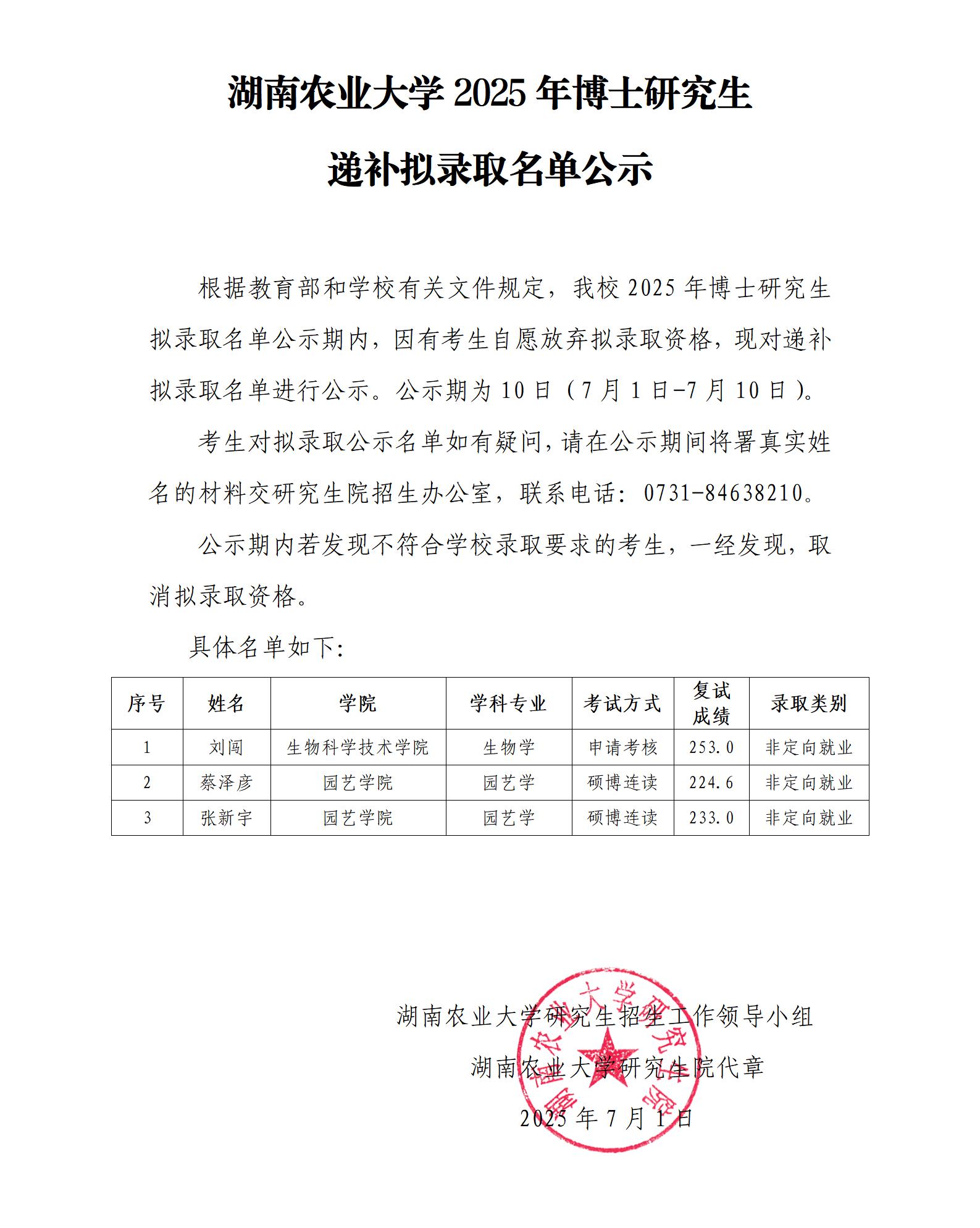 湖南农业大学2025年博士研究生递补拟录取名单公示