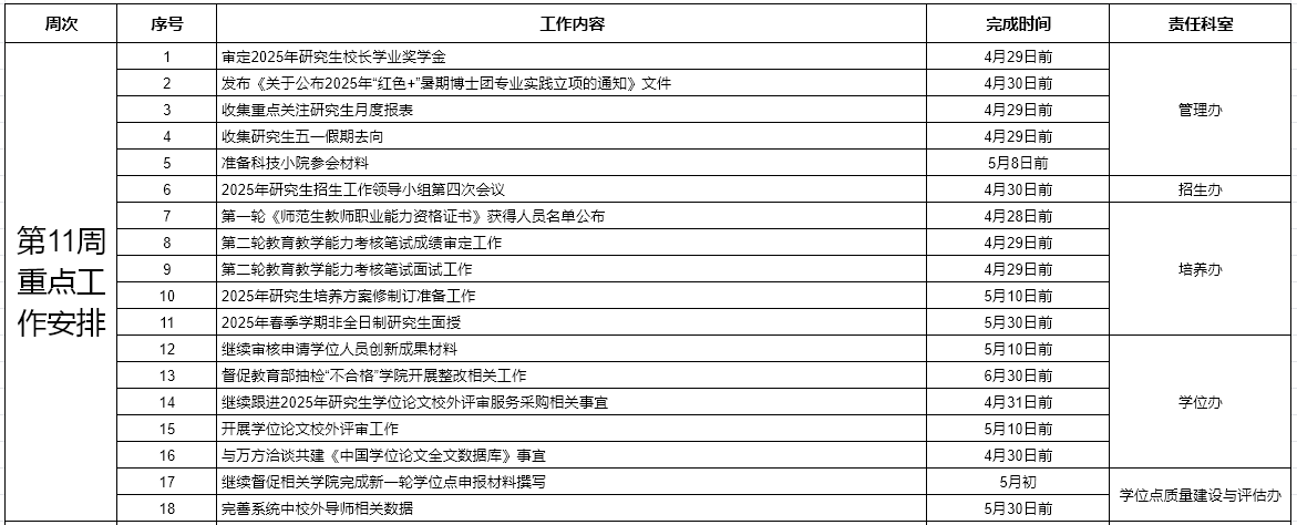 研究生工作部、研究生院2025年春季学期第十一周工作计划