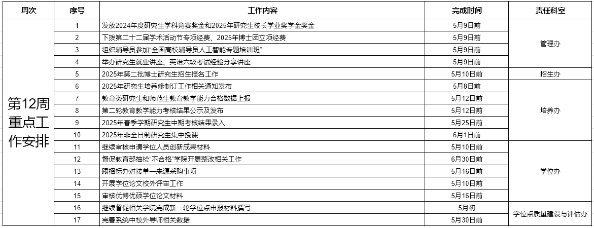 研究生工作部、研究生院2025年春季学期第十二周工作计划