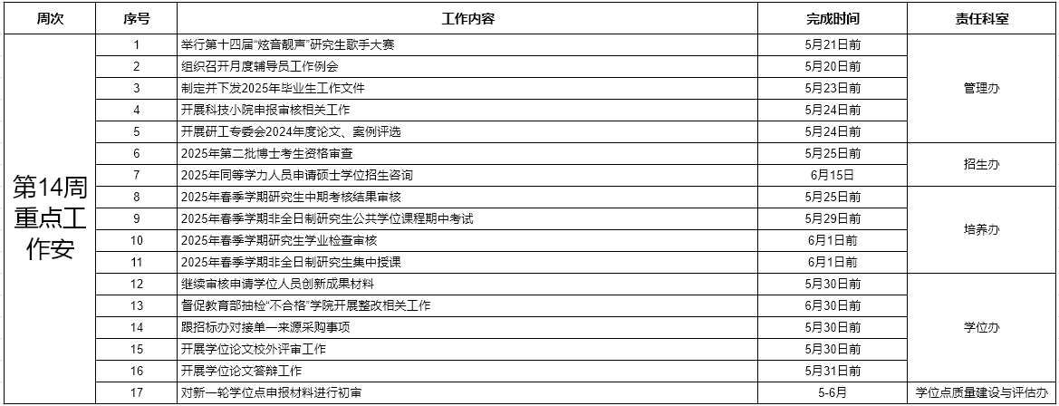 研究生工作部、研究生院2025年春季学期第十四周工作计划