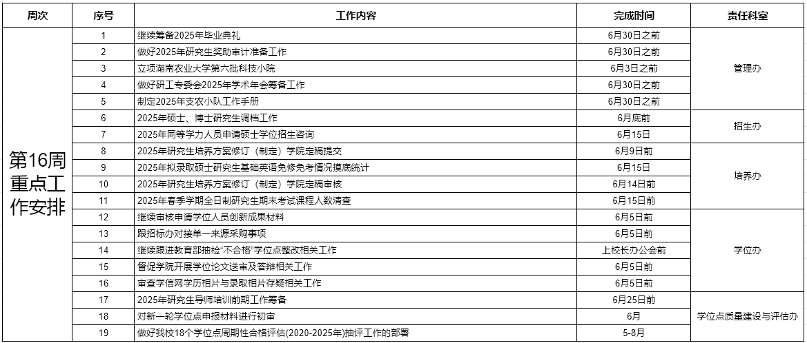 研究生工作部、研究生院2025年春季学期第十六周工作计划