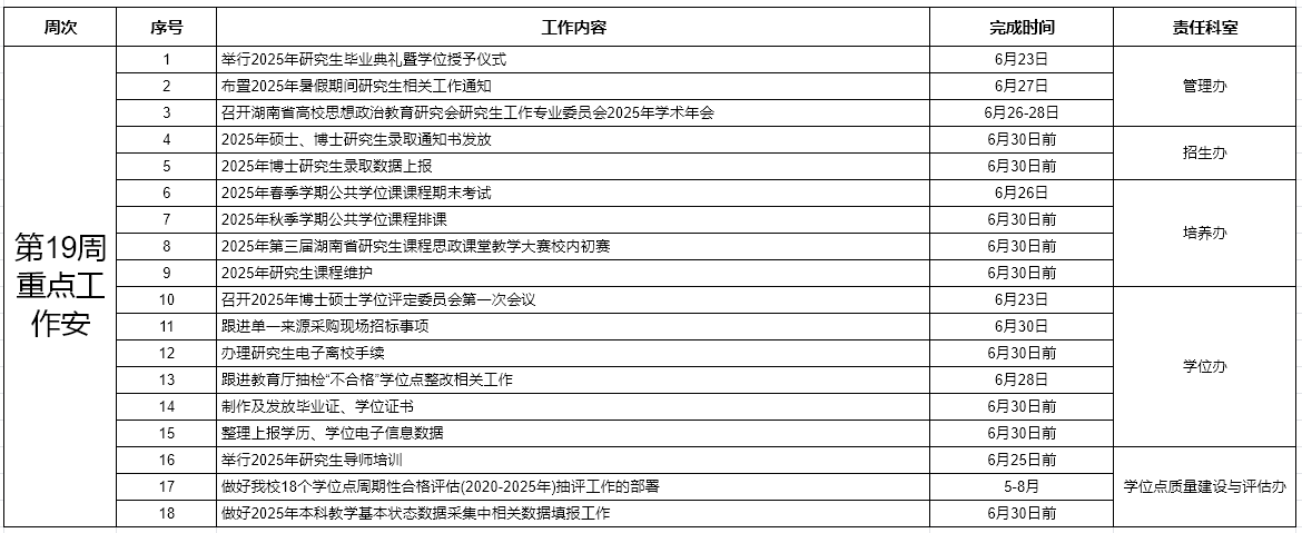 研究生工作部、研究生院2025年春季学期第十九周工作计划