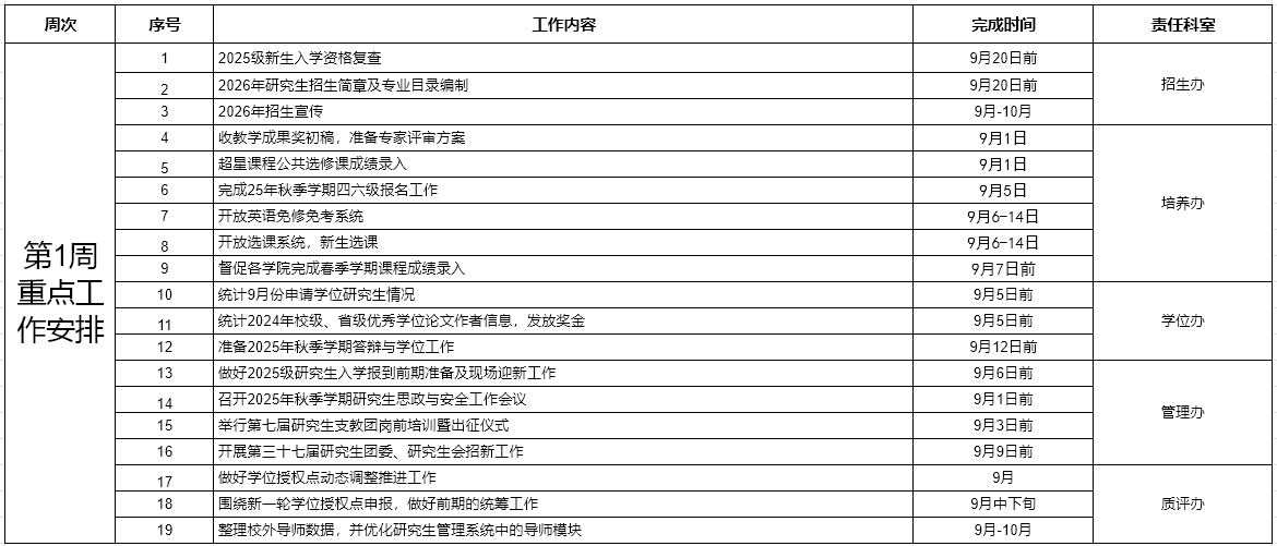 研究生工作部、研究生院2025年秋季学期第一周工作计划