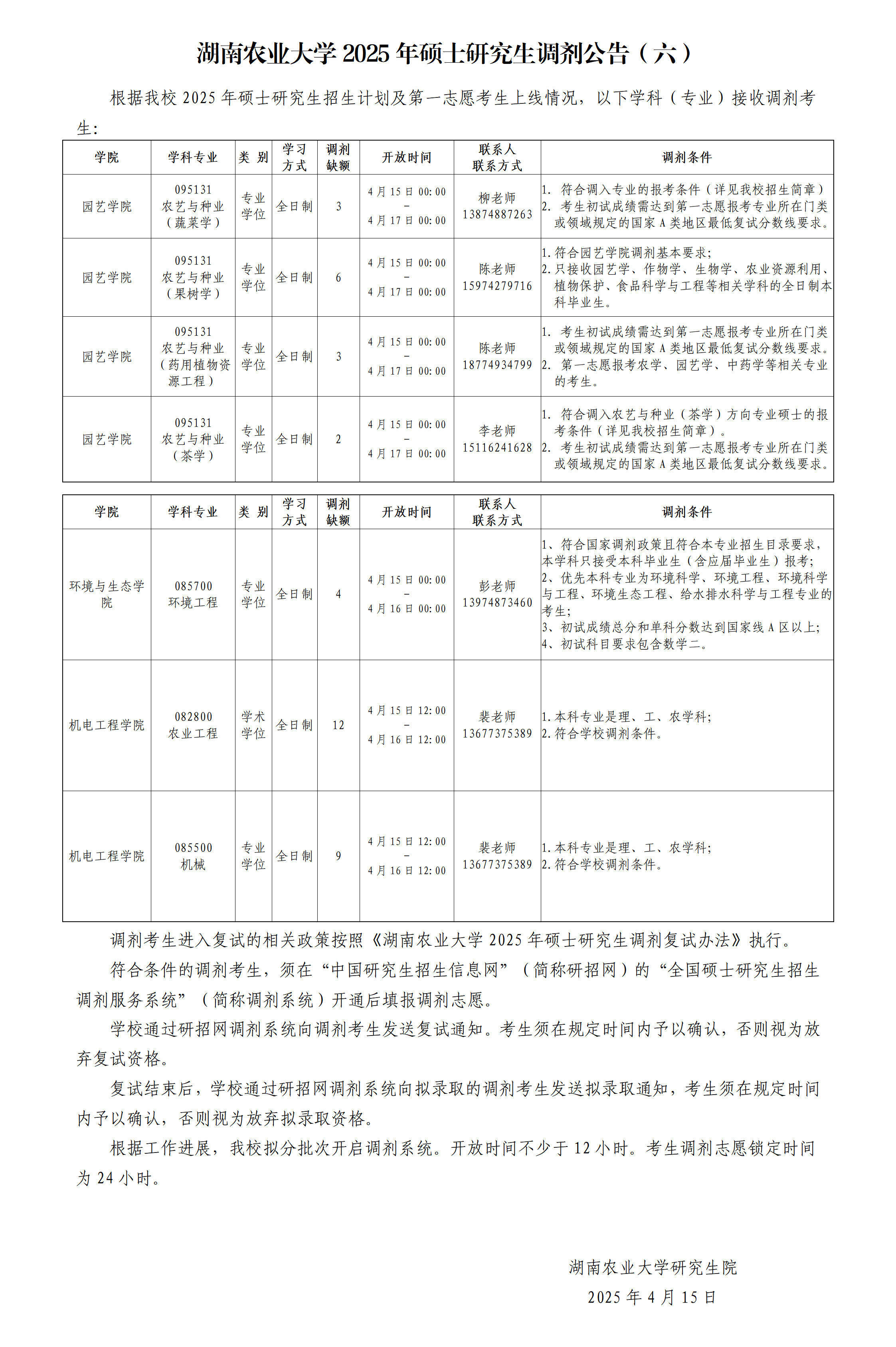 湖南农业大学2025年硕士研究生调剂公告(六)