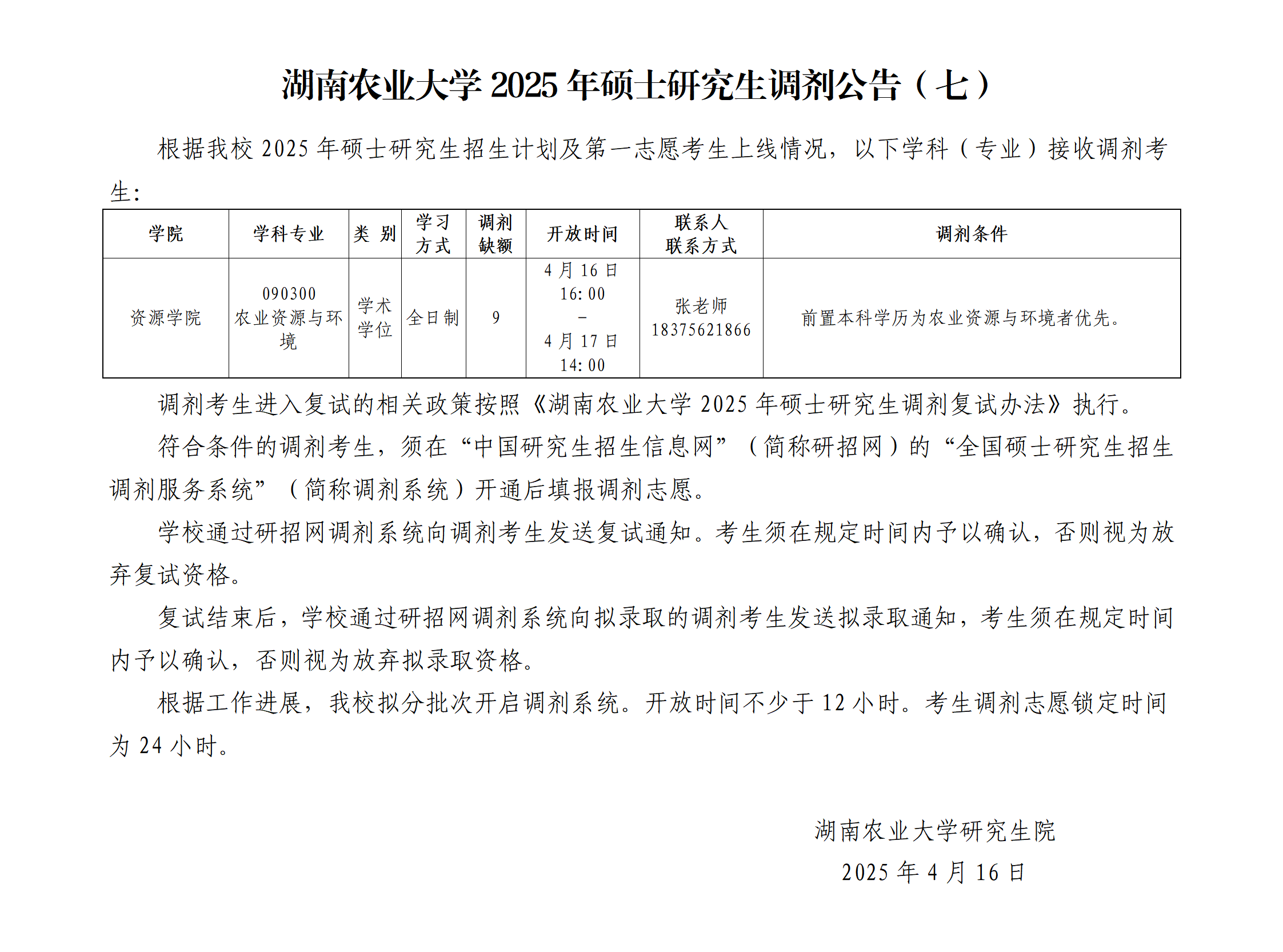 湖南农业大学2025年硕士研究生调剂公告(七)